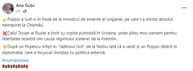 „Popșoi a luat-o în freză de la ministrul de externe al Ungariei, pe care l-a invitat absolut neinspirat la Chișinău. Calul Troian al Rusiei a lovit cu copita putinistă în Ucraina, unde zilnic mor oameni pentru libertatea noastră din cauza regimului scelerat de la Kremlin. După un Popescu înfipt în „războiul civil” de la Nistru, iată că a venit și un Popșoi rătăcit în diplomație, care a încurcat miriștea cu politica externă”, a notat Guțu.