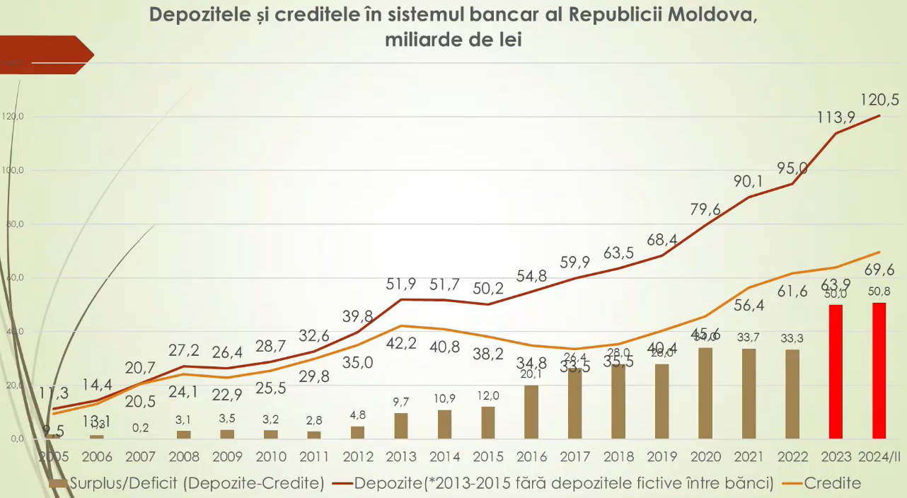 Un alt aspect îngrijorător pentru situația din sistemul bancar este creșterea constantă și abruptă a decalajului dintre volumul depozitelor și soldul creditelor. Până la furtul bancar, aceasta era mică și exprima o situație normală pentru o economie – băncile luau la păstrare banii cetățenilor și îi ofereau cu împrumut agenților economici. Acum, volumul depozitelor a depășit 120 de miliarde de lei, considerabil mai mare față de soldul creditelor. Ca urmare, în bănci s-a creat un exces de lichidități de 50,8 miliarde de lei, ceea ce, de asemenea, este fără precedent în istoria țării.