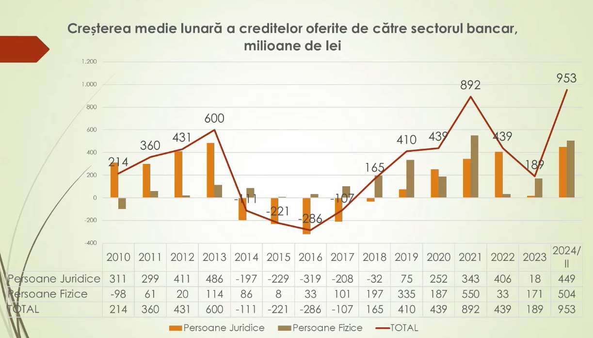 Primul aspect îngrijorător este ponderea prea mare a creditelor contractate de persoanele fizice, în detrimentul persoanelor juridice. Asta înseamnă că nu se creditează economia, pentru a asigura dezvoltare și creștere economică. Or, până în 2014, din șase lui împrumutați lunar din bănci aproape cinci le reveneau agenților economici. În 2023, din 10 lei împrumutați lunar de la bănci, nouă le reveneau persoanelor fizice, iar în acest an raportul este de aproape 50 la 50, a specificat Veaceslav Ioniță.