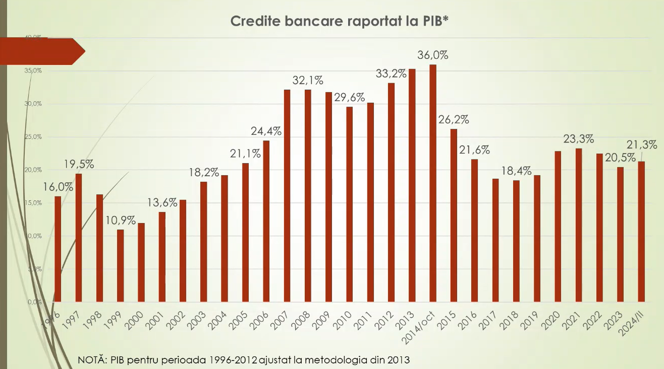 Cel mai important aspect, care denotă calitatea procesului de creditare este însă, potrivit economistului, ponderea împrumuturilor în produsul intern brut. La acest capitol, chiar dacă soldul creditelor a atins în acest an cel mai înalt nivel din istorie, situația este mai proastă ca în alți ani. Și asta pentru că, raportat la volumul economiei, portofoliul de credite reprezintă doar 21,3 la sută sau mai puțin decât a fost în 2020, 2021 și 2022. Cea mai bună situație la acest capitol a fost atestată în perioada 2006-2015, iar apogeul a fost înregistrat în octombrie 2014, când ponderea creditelor în economie era de 36 la sută.