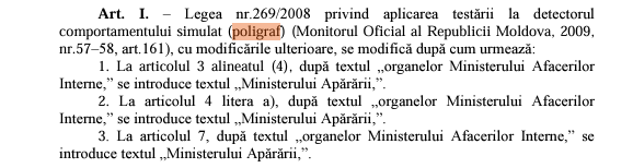 „Astfel, se propune instituirea testului la detectorul comportamentului simulat (poligraf) pentru cetățenii Republicii Moldova care doresc să se încadreze în serviciul militar. Aceste teste pot fi parte din procesul de numire în funcții militare și respectiv de identificare a personalului care ar putea expune instituția de apărare riscului scurgerii a unor informații atribuite la secret de stat sau cu accesibilitate limitată”, se menționează în nota informativă la proiectul de lege.