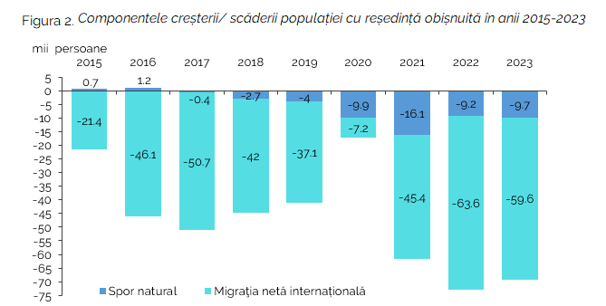 Sporul natural negativ în anul 2023 a fost de 9.700 de oameni, în creștere cu 500 față de anul 2022.