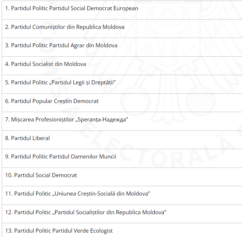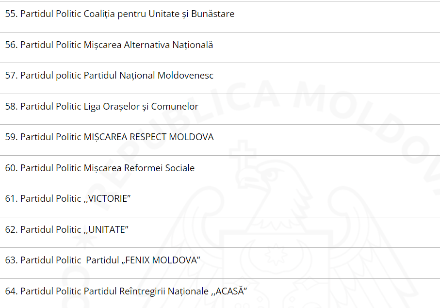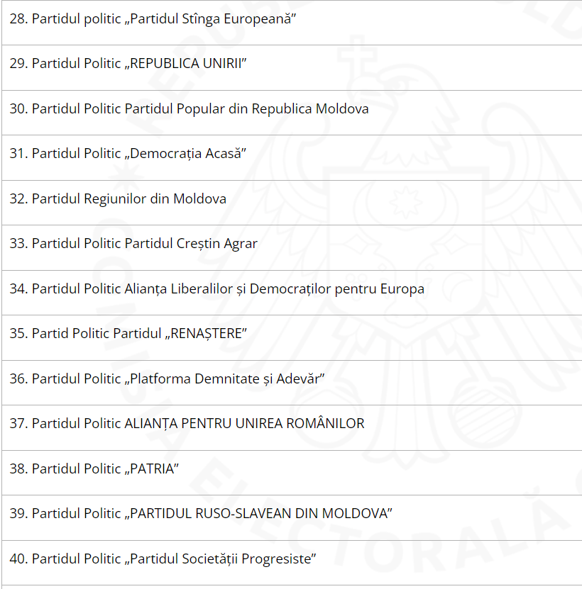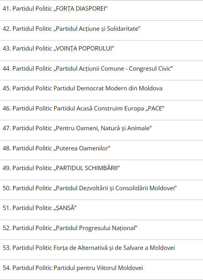Din lista publicată de CEC lipsește Partidul Politic „Șor”, care a fost declarat neconstituțional, însă au fost incluse partidele „Șansă”, „Renaștere” și „Victorie”. De asemenea, în listă figurează și formațiuni noi, precum Partidul „Fenix Moldova” sau Partidul Reîntregirii Naționale „Acasă”.