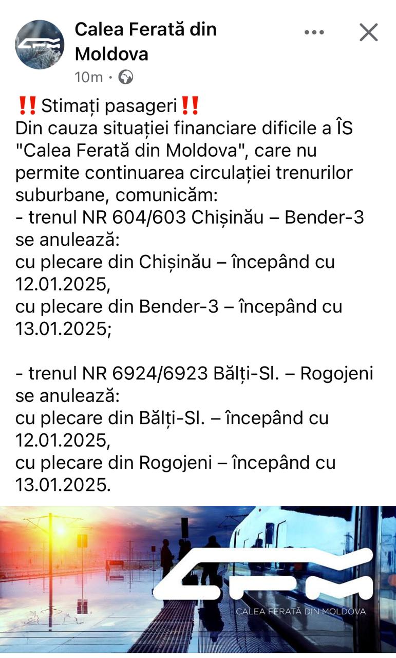 Criza de la întreprinderea strategică de stat „Calea Ferată din Moldova” se acutizează. Compania anunță că, din cauza situației financiare dificile, sistează mai multe curse, din 12 și 13 ianuarie.
