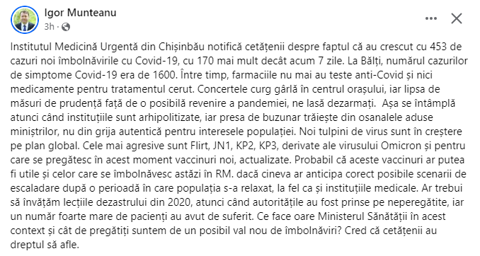 „Institutul Medicină Urgentă din Chișinău notifică cetățenii despre faptul că au crescut cu 453 de cazuri noi îmbolnăvirile cu COVID-19, cu 170 mai mult decât acum 7 zile. La Bălți, numărul cazurilor de simptome Covid-19 era de 1600. Între timp, farmaciile nu mai au teste antiCovid și nici medicamente pentru tratamentul cerut. Concertele curg gârlă în centrul orașului, iar lipsa de măsuri de prudență față de o posibilă revenire a pandemiei, ne lasă dezarmați”, atenționează Igor Munteanu.