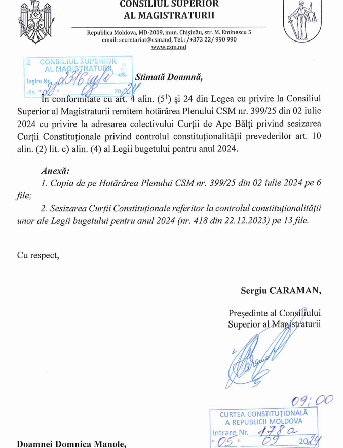 Consiliul Superior al Magistraturii a sesizat Curtea Constituțională asupra diferenței salariale dintre angajații Parlamentului și Guvernului. Autorul sesizării solicită egalarea angajaților curților de apel și Curții Supreme de Justiție cu ale celor din forul executiv și cel legislativ, în baza principiului egalității, stabilit în articolul 16 din Constituție.