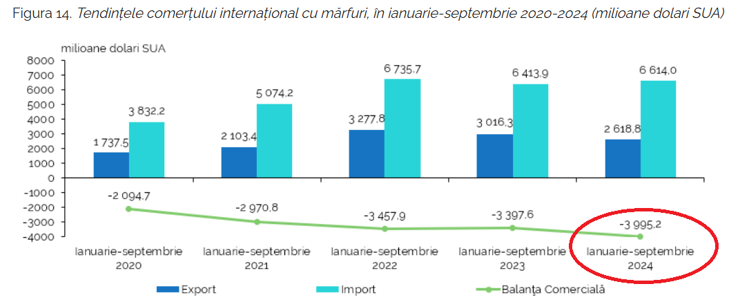 Potrivit Biroului Național de Statistică, în nouă luni ale acestui an, deficitul balanței comerciale a ajuns la aproape 4 miliarde de dolari, cel mai înalt din ultimele decenii. Acesta a crescut în acest an cu 17,6 la sută, ceea ce înseamnă că Moldova importă mai mult și exportă tot mai puțin.