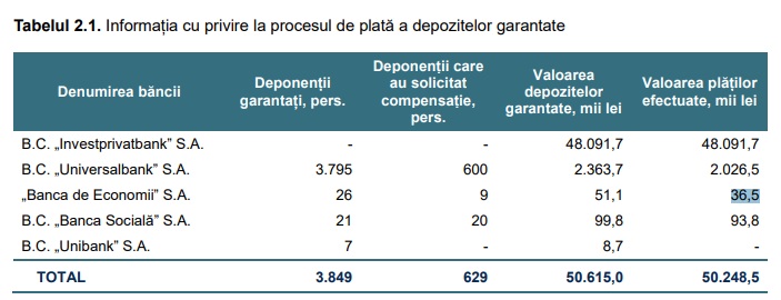 Fondul de garantare a depozitelor în sistemul bancar a efectuat, de la fondare, în 2004, plăți de 50 de milioane 248,5 mii de lei. Mai mult de 48 de milioane de lei le-au revenit deponenților ”Investrivatbank”, iar mai mult de două milioane – celor de la ”Universalbank”. Deponenții ”Băncii de Economii” au primit doar 36,3 mii de lei, iar cei ai ”Băncii Sociale” – 93,8 mii de lei.