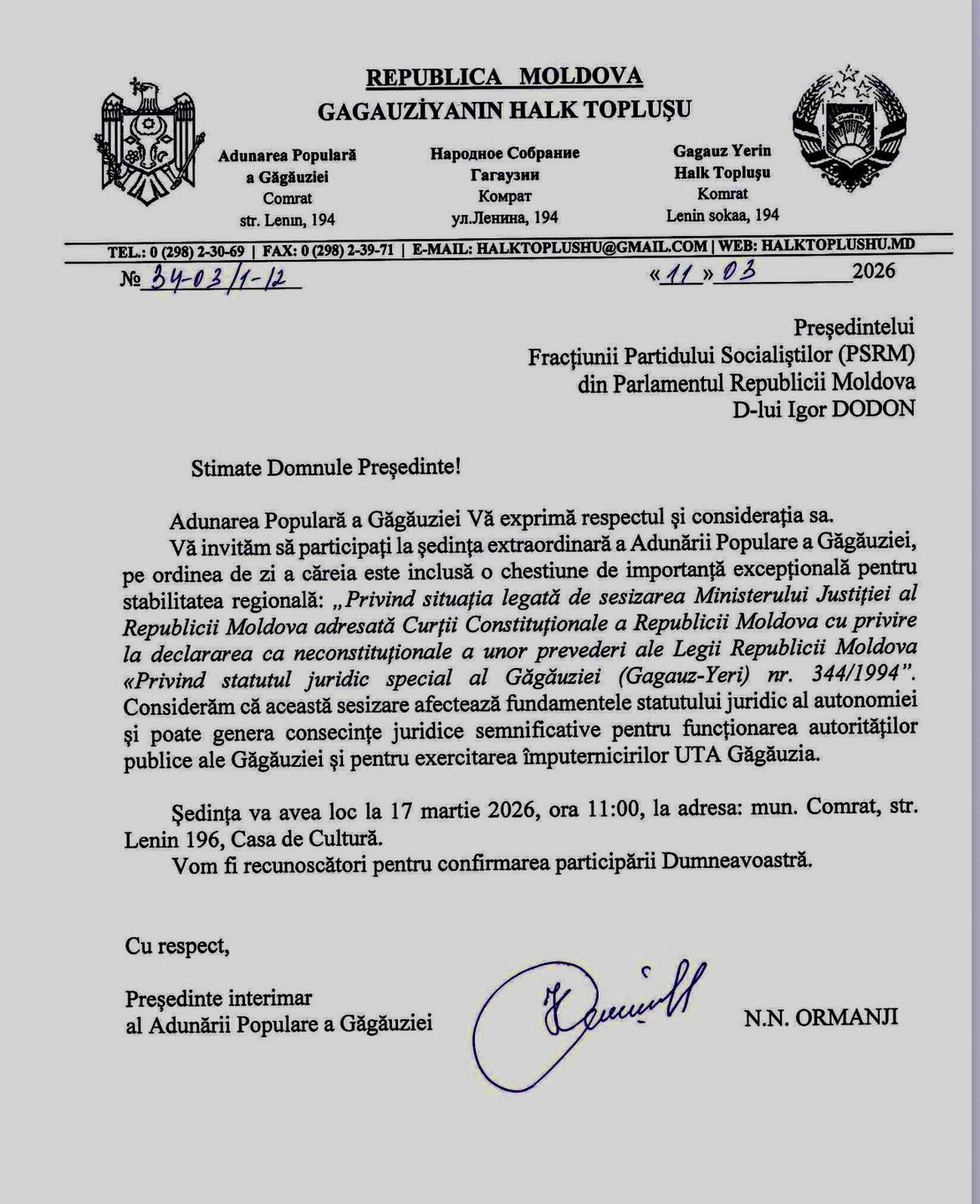 „Recent, am primit o invitație de a participa la o sesiune extraordinară a Adunării Populare a Găgăuziei, care va avea loc săptămâna viitoare la Comrat. Aceasta va examina o problemă de o importanță excepțională pentru stabilitatea regională: apelul Ministerului Justiției din Republica Moldova la Curtea Constituțională pentru a declara neconstituționale anumite prevederi ale Legii „Privind statutul juridic al Găgăuziei”. Cred că este crucial ca ambele părți să dea dovadă de responsabilitate și înțelepciune politică în această situație. Astăzi, trebuie să căutăm urgent soluții de compromis, să restabilim dialogul dintre autoritățile centrale și regiunea autonomă și să menținem echilibrul atins cu decenii în urmă”, susține Igor Dodon.