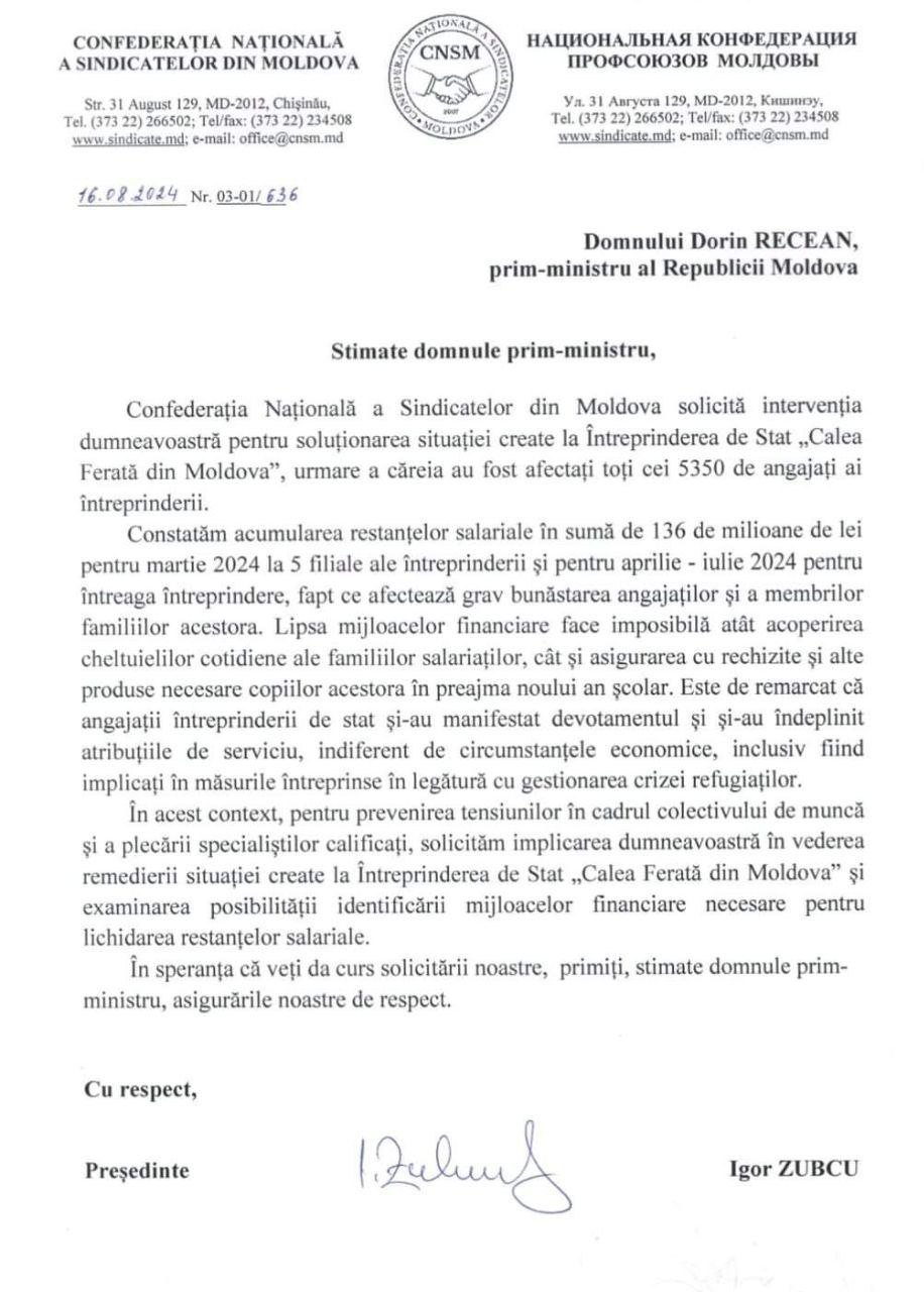„În acest context, pentru prevenirea tensiunilor în cadrul colectivului de muncă şi a plecării specialiștilor calificați, solicităm implicarea dumneavoastră în vederea remedierii situației create la întreprinderea de stat „Calea Ferată din Moldova” şi examinarea posibilității identificării mijloacelor financiare necesare pentru lichidarea restanțelor salariale”, notează Confederația Națională a Sindicatelor.
