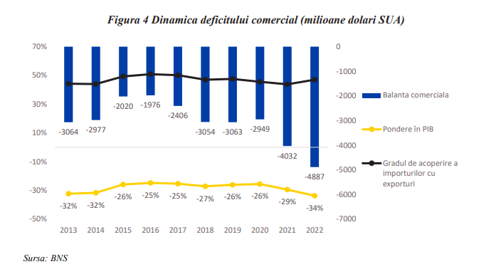 „În anul 2022, balanța comercială a Republicii Moldova a fost de minus 4,9 miliarde dolari SUA sau 34% din PIB. Excluzând combustibilii, balanța comercială a însumat minus 2,9 miliarde dolari sau 19,9% din PIB, ceea ce reprezintă o înrăutățire cu 2,4 puncte procentuale comparativ cu 2017. Observăm că, pe parcursul perioadei analizate, gradul de acoperire a importurilor prin exporturi nu a deviat considerabil: în 2022. Acesta a constituit 47%, un pic superior celui din 2013, la nivelul de 44%. Cu alte cuvinte, volumul importurilor rămâne a fi cel puțin dublu față de volumul exporturilor de bunuri și acest lucru continuă să reprezinte o sursă de vulnerabilitate”, se mai menționează în Programului național de atragerea investițiilor și promovare a exporturilor pentru anii 2024-2028.