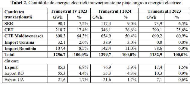 Pe parcursul primelor trei luni din acest an, producerea locală de energie electrică a reprezentat aproximativ 41 la sută din consumul total de 463 de milioane kWh. 16 la sută din aceasta îi revine energiei eoliene, 74 la sută - CET-urilor urbane, câte patru la sută au fost produse de ÎS „Nodul Hidroenergetic Costești” și panourile fotovoltaice și doar aproape un procent - din biogaz.