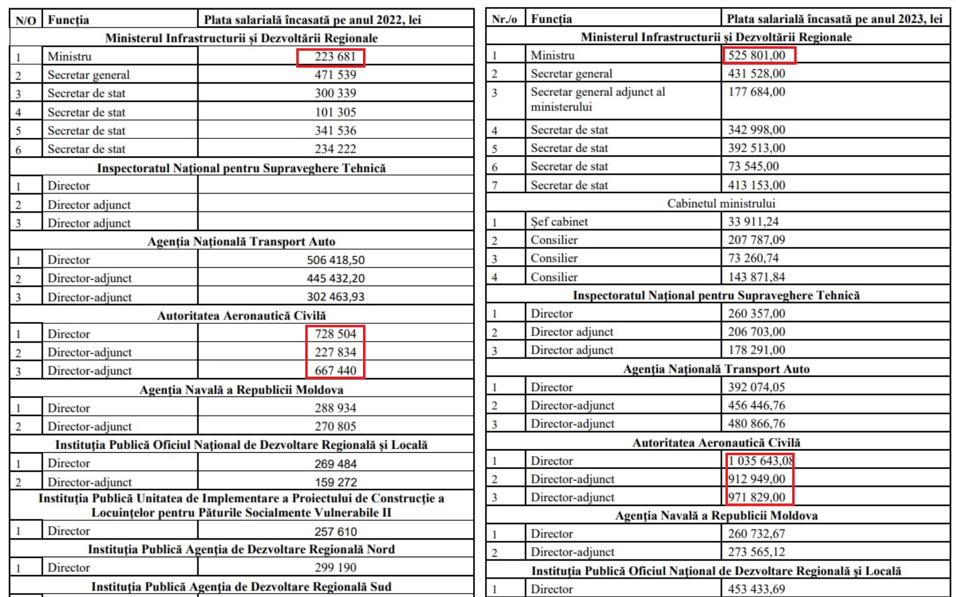 Datele oferite de Ministerul Infrastructurii și Dezvoltării Regionale arată că, în 2022, secretarii de stat ai acestei subdiviziuni a Guvernului aveau lefuri mai mari decât cea a ministrului. Secretarul general al MIDR a primit chiar de două ori mai mult față de Spînu. Totul s-a schimbat însă în 2023, când leafa ministrului a crescut de două ori și a fost de departe mai mare decât cele ale secretarilor de stat.