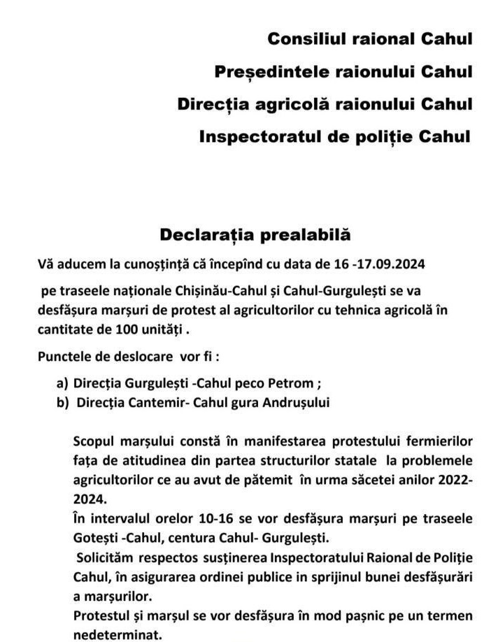 „Protestul și marșul se vor desfășura pașnic, pe o perioadă nedeterminată”, se mai menționează în declarația fermierilor, depusă la consiliul raional, direcția agricultură și Inspectoratul de poliție Cahul.