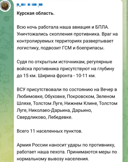 Deși forțele armate ruse au încercat să riposteze cu ajutorul aviației, s-a constatat că ucrainenii au reușit să asigure o apărare antiaeriană robustă, care a obligat aviația inamică să opereze la altitudine extrem de joasă, ceea ce a scăzut semnificativ din eficiență. Miercuri, canalele de Telegram rusești, specializate în monitorizarea teatrului de lupte, au anunțat că armata ucraineană a pătruns la 15 kilometri în interiorul Federației Ruse pe o lungime a frontului de până la 11 kilometri.