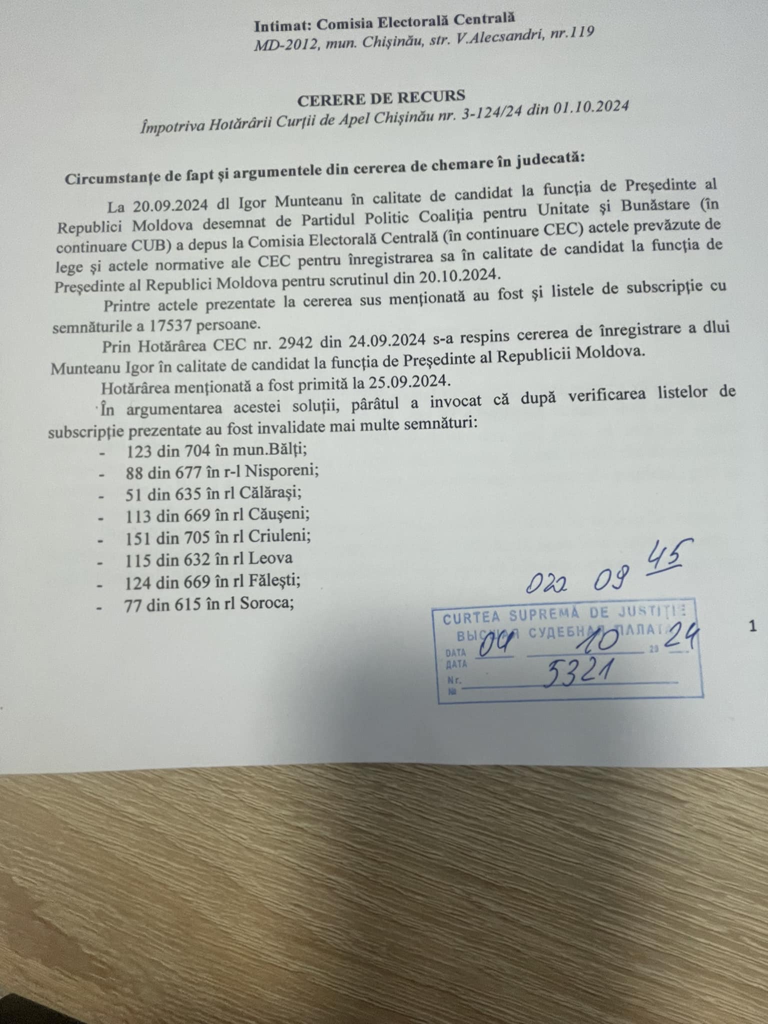 Președintele Partidului „Coaliția pentru Unitate și Bunăstare”, Igor Munteanu, a atacat cu recurs la Curtea Supremă de Justiție hotărârea Curții de Apel Chișinău, care i-a dat câștig de cauză Comisiei Electorale Centrale, care l-a scos din alegerile prezidențiale. Munteanu a reiterat că decizia instanței de apel este „ilegală și neîntemeiată”.