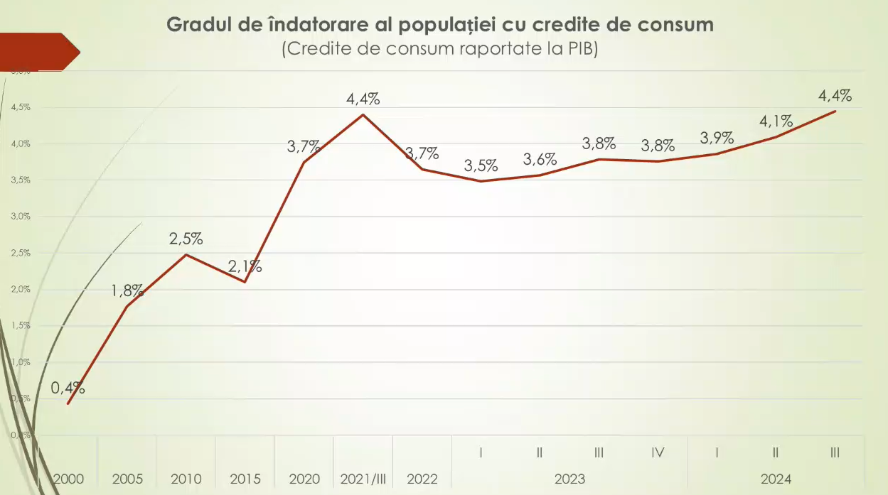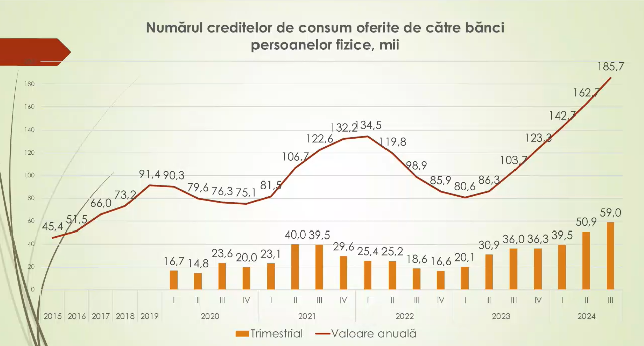 „În trimestrul trei, cetățenii noștri au reușit să se împrumute cu patru miliarde de lei. Deci comparativ cu perioada din 2022, când am ajuns la 1,4 miliarde, avem o creștere de 2,5 ori, da fapt de trei ori. Deci practic cetățenii noștri se creditează acum de teri ori mai mult, ca volum de bani, decât acum doi ani”, a adăugat analistul.