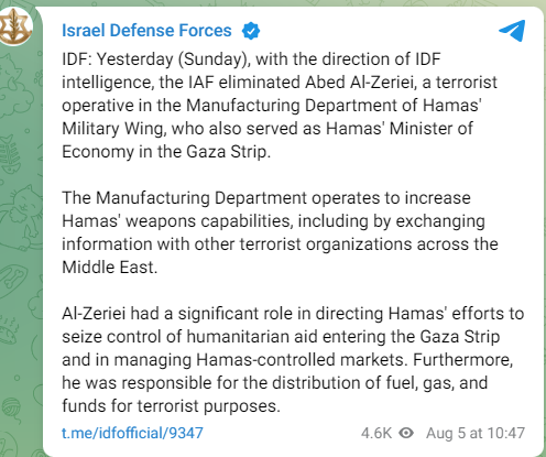 „Ieri (duminică), sub îndrumarea serviciilor de informații ale IDF, IAF l-a eliminat pe Abed Al-Zeriei, un agent terorist din cadrul Departamentului de Producție al Aripei militare a Hamas, care a fost, de asemenea, ministru al Economiei al Hamas în Fâșia Gaza”, se menționează în anunț.