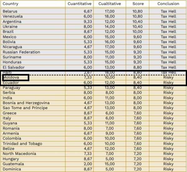 Republica Moldova a fost, anul trecut, la limita „iadului fiscal”. Acest termen este folosit pentru țările cu cea mai mare presiune fiscală, cea mai proastă guvernare și cu un înalt nivel al corupției. Indicele este întocmit anual de Fundația 1841. Potrivit acestuia, Republica Moldova s-a clasat pe locul 14, imediat după categoria țărilor cu „iad fiscal”, între Haiti și Ecuador, fiindu-i atribuit calificativul de țară cu risc pentru afaceri.