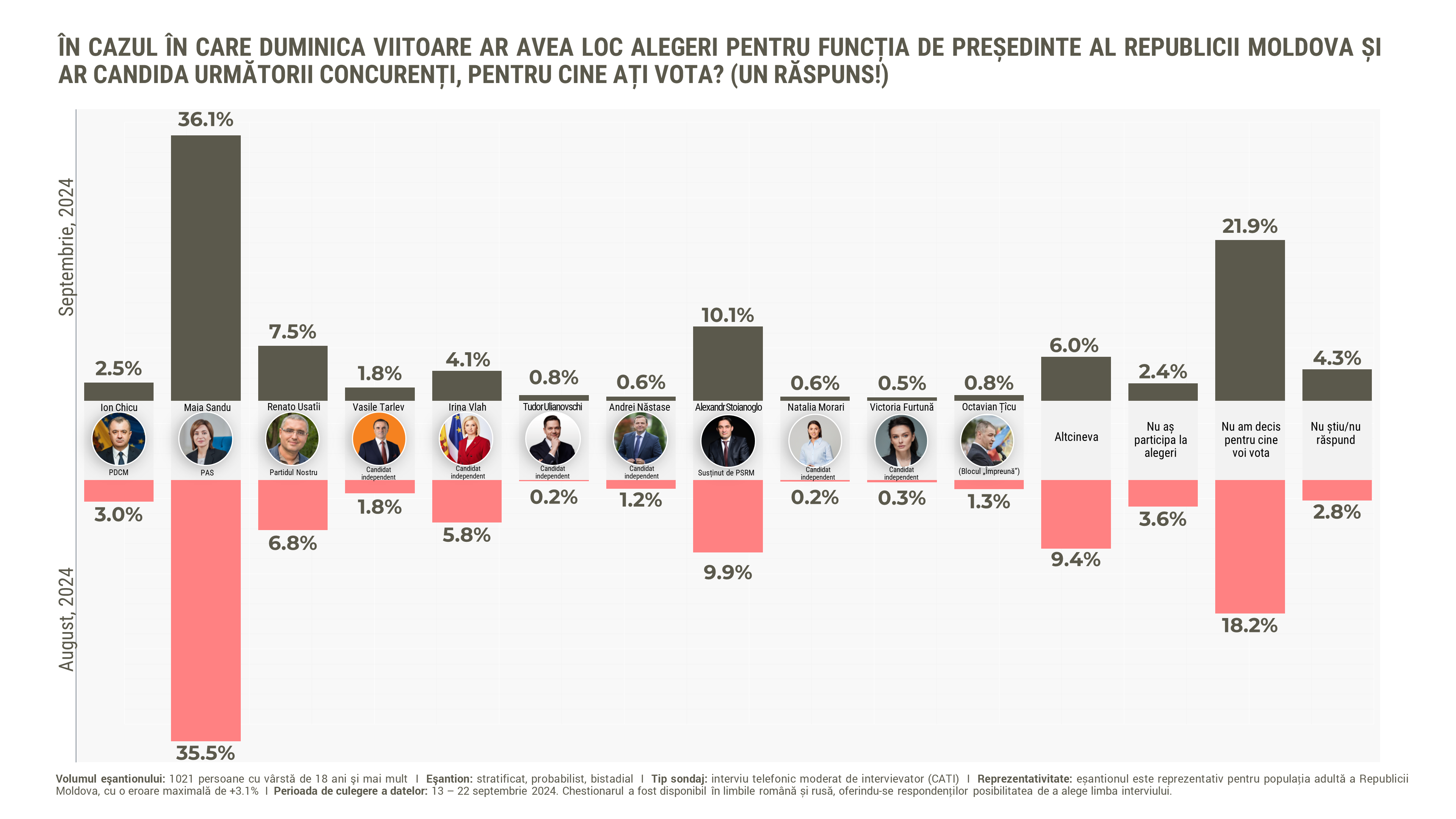 La întrebarea „În cazul în care duminica viitoare ar avea loc alegeri pentru funcția de președinte al Republicii Moldova și ar candida următorii concurenți, pentru cine ați vota?”, 36,1 la sută au menționat-o pe șefa în exercițiu a țării, iar 10,1 la sută – pe numărul unu din buletinul de vot, Alexandr Stoianoglo, susținut de PSRM. Urmează candidatul „Partidului Nostru”, Renato Usatîi, cu 7,5 la sută, și candidatul independent Irina Vlah, cu 4,1 la sută. Pentru candidatul Partidului Dezvoltării și Consolidării Moldovei, Ion Chicu, au optat 2,5 la sută, iar pentru candidatul independent Vasile Tarlev – 1,8 la sută. Octavian Țîcu, din partea Blocului electoral „Împreună” și candidatul independent Tudor Ulianovschi au fost menționați de 0,8 la sută dintre subiecții sondajului, iar candidații independenți Andrei Năstase și Natalia Morari – de 0,6 la sută. Ultima în clasament, cu 0,5 la sută, este fostul procuror anticorupție Victoria Furtună.
