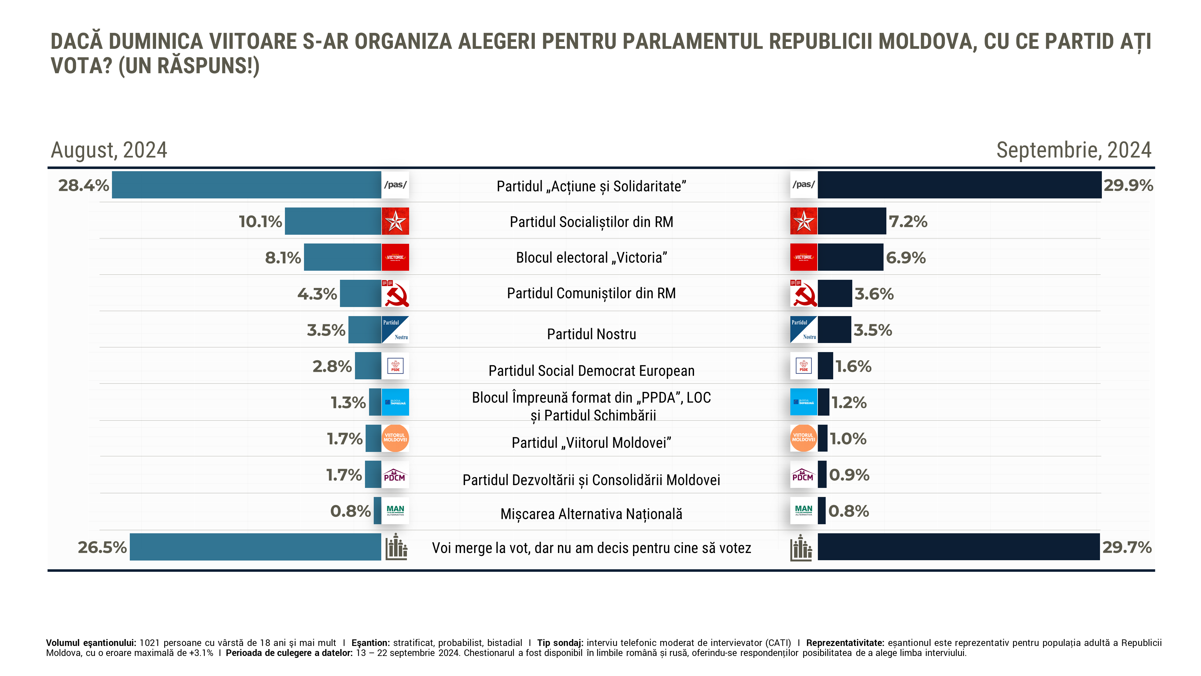 În cazul în care duminica viitoare ar avea loc alegeri parlamentare, pe primul loc s-ar clasa, potrivit cercetării, PAS, cu 29,9 la sută, urmat de PSRM, cu 7,2 la sută, Blocul „Victoria”, cu 6,9 la sută. Celelalte formațiuni politice nu ar trece pragul electoral de cinci la sută, potrivit apare Watchdog Moldova.