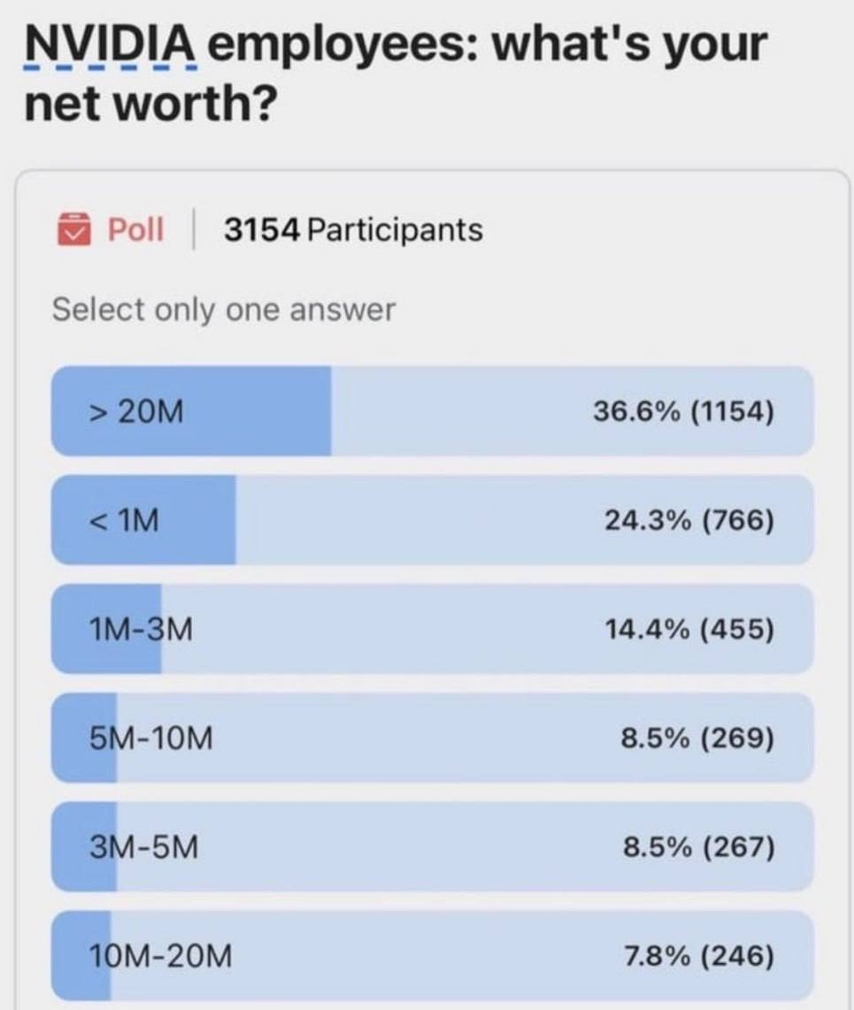 Mai mult de două treimi dintre angajații celor mai scumpe companii din lume sunt milionari în dolari. O arată rezultatele unui sondaj anonim, realizat pe forumul Blind pentru profesioniștii din industria IT pentru angajații Nvidia, a doua din lume după capitalizare. Potrivit acestora, doar 24 la sută au indicat venituri nete de până la un milion de dolari.