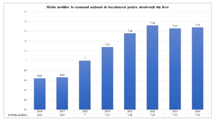Media mediilor obținută de absolvenții din licee în sesiunea 2024 nu s-a modificat esențial față de cea înregistrată în sesiunea 2023. Astfel, pentru candidații din licee, media este 7,34, comparativ cu 7,33 în 2023.
