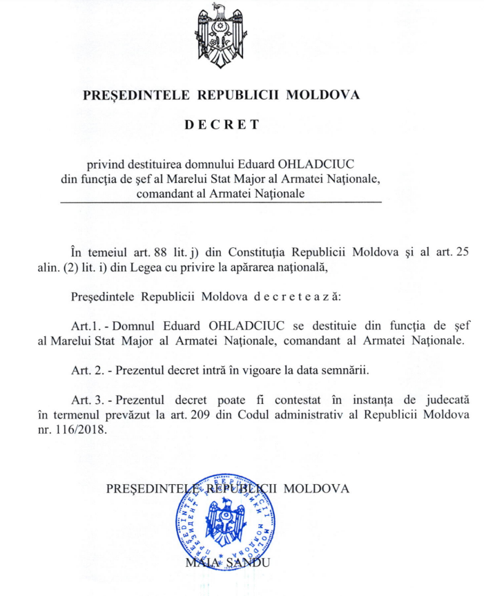 Șeful Marelui stat Major al Armatei Naționale, Eduard Ohladciuc, a fost demis. Un decret în acest sens a fost semnat de președintele în exercițiu, Maia Sandu. Solicitarea către șefa statului de a-l demite pe generalul de brigadă a venit din partea Ministerului Apărării și a fost aprobată de Guvern în ședința din 18 septembrie.