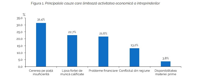 În trimestrul doi al anului, din numărul total al managerilor intervievați, 58 la sută au declarat că s-au confruntat cu limitări în activitatea economică. Principala cauză este cererea slabă - 31,4% din subiecți au reclamat acest factor. De asemenea, activitatea întreprinderilor este influențată negativ de lipsa forței de muncă - 22,7%, probleme financiare - 21,6%, consecințele crizei provocate de războiul din Ucraina - 13,2%.