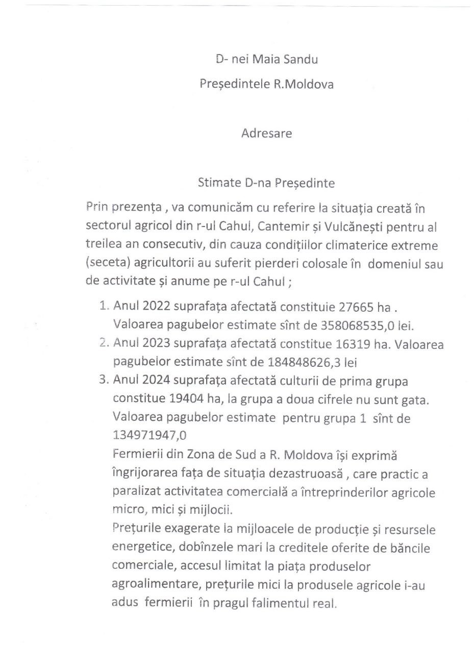 Micii fermieri cer ajutor din partea statului, pentru a supraviețui în urma secetei cumplite din raioanele Cahul, Cantemir și Vulcănești. Într-o scrisoare adresată șefei statului, aceștia menționează că, în ultimii trei ani, au suportat din această cauză prejudicii de aproape 700 de milioane de lei. Semnatarii scrisorii mai spun că toate apelurile lor către Ministerul Agriculturii nu au fost luate în considerare.