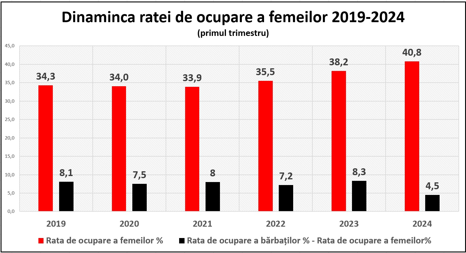 Potrivit Biroului Național de Statistică, ponderea femeilor în populația ocupată era de 48,5% față de 51,5% bărbați în 2022. Iar ecartul de gen al ocupării a constituit aproape 8 puncte procentuale în 2022: în rândul femeilor rata de ocupare era de 36,8% în comparație cu 44,7% la bărbați.