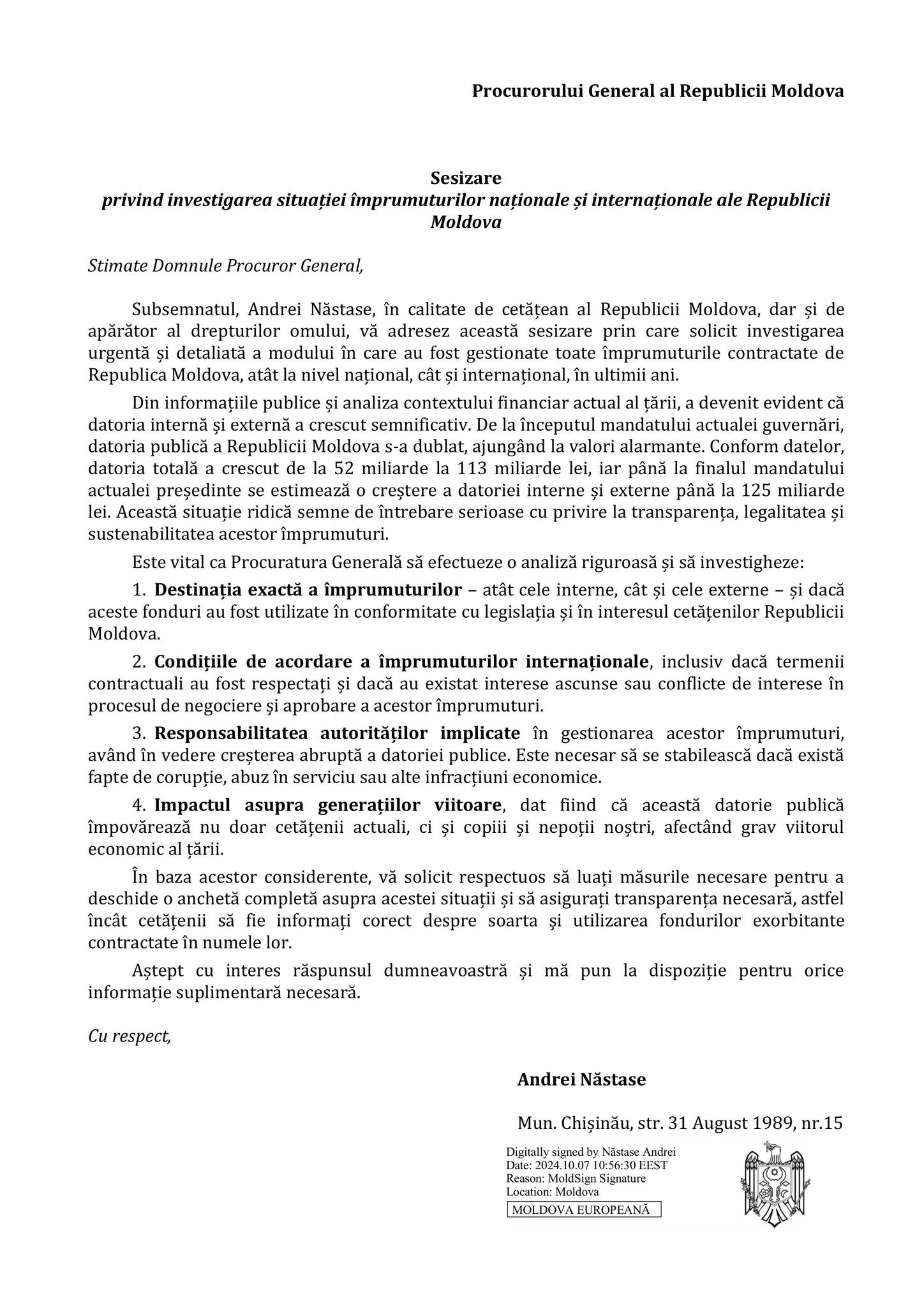 El insistă ca Procuratura Generală să analizeze destinația exactă a împrumuturilor și dacă banii au fost utilizați în conformitate cu legislația și în interesul cetățenilor Republicii Moldova. De asemenea, candidatul solicită ca procurorii să afle dacă termenele contractuali au fost respectați și dacă au existat interese ascunse sau conflicte de interese în procesul de negociere și aprobare a acestor împrumuturi.
