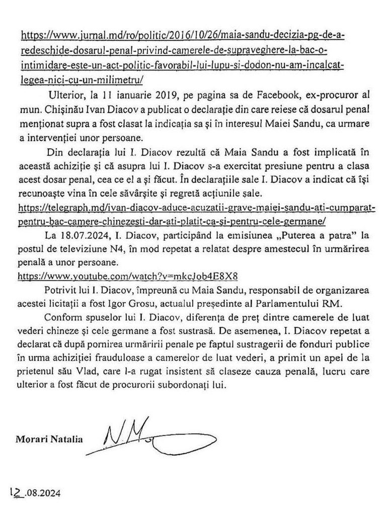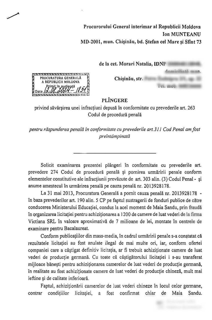 Candidata pentru funcția de președinte al Republicii Moldova, Natalia Morari, a depus luni, 12 august, o plângere la Procuratura Generală privind tragerea la răspundere penală a Maiei Sandu. În demers, autoarea nu vizează activitatea de șefă a statului a Maiei Sandu, ci de ministru al Educației, pentru pretinse acțiuni de acum 11 ani.