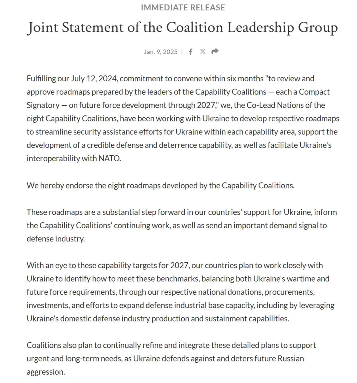 „Îndeplinindu-ne angajamentul din 12 iulie 2024 de a ne reuni în termen de șase luni „pentru a revizui și aproba foile de parcurs pregătite de liderii coalițiilor de capabilități - fiecare semnatar al Pactului - privind dezvoltarea viitoare a forțelor până în 2027”, noi, națiunile colidere ale celor opt coaliții de capabilități, am colaborat cu Ucraina în vederea elaborării foilor de parcurs necesare pentru a raționaliza eforturile de asistență în materie de securitate pentru Ucraina în cadrul fiecărui domeniu de capabilități, a sprijini dezvoltarea unei capacități credibile de apărare și descurajare, precum și a facilita interoperabilitatea Ucrainei cu NATO”, se menționează în comunicatul Departamentului Apărării al SUA.