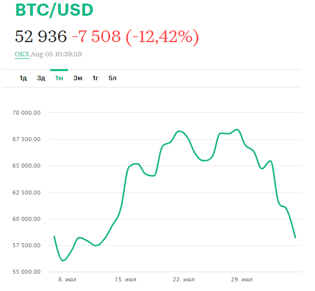 O situație similară s-a înregistrat și pe piața criptovalutei. Cursul bitcoinului a căzut, luni dimieață, 5 august, mai jos de 50 de mii de dolari – cea mai dramatică depreciere din 2021. Este vorba de o cădere cu 18 la sută. Încă în data de 2 august, bitcoinul se tranzacționa cu peste 65 de mii de dolari, iar de duminică, 4 august, a început deprecierea bruscă. Ulterior, criptomoneda și-a recuperat o parte din pierdere.