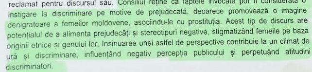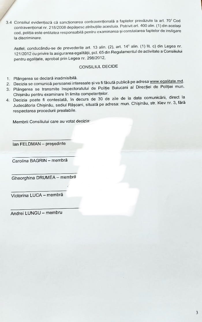 Deși a calificat drept inadmisibilă plângerea alesei poporului, Consiliul pentru Egalitate a decis transmiterea plângerii Inspectoratului de Poliție Buiucani, pentru examinare în limita competențelor.