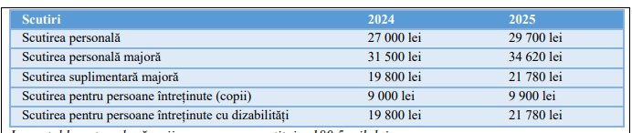 Guvernul a aprobat, în ședința de luni, 8 iulie, proiectul de lege privind modificarea unor acte normative ce vizează politica bugetar-fiscală și vamală pentru anul 2025. Documentul prevede, între altele, majorarea cu 10 la sută a scutirilor pentru persoanele fizice, de la 27.000 lei până la 29.700 de lei și, respectiv, de la 31.500 de lei până la 34.620 lei a scutirii personale majore.