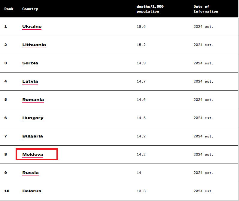 Cel mai prost la aceste capitole stă Ucraina, puternic afectată de război. În țara vecină, rata mortalității este de 18,6 la 1.000 de persoane. În același timp, Ucraina ocupă ultimul loc la capitolul natalitate, cu șase nașteri la 1.000 de populație.