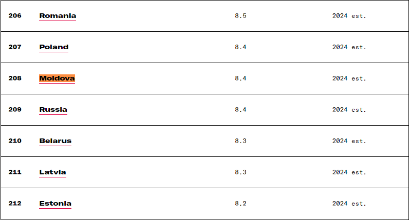 Republica Moldova se află printre țările cu cea mai înaltă rată a mortalității și cu una dintre cele mai joase rate ale natalității. Constatarea îi aparține serviciului de inteligență al Statelor Unite ale Americii, care a făcut public cel mai proaspăt raport. Documentul arată că, la capitolul mortalitate, țara noastră este pe locul opt în lume, iar la capitolul natalitate – pe locul 208.