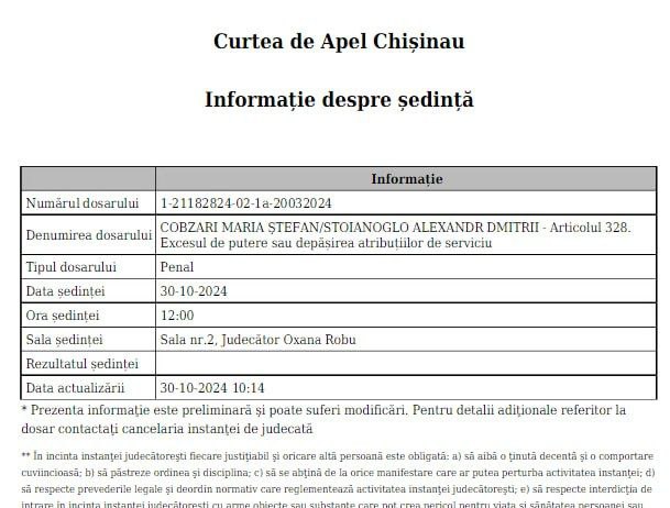 Judecătoarea care a stabilit data și ora ședinței este Oxana Robu.