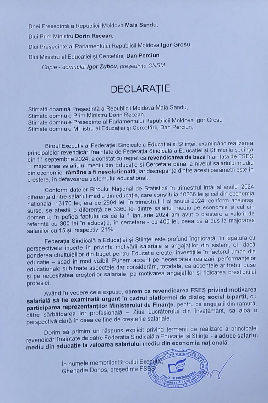 Sindicatele din Educație și Știință le cer autorităților egalarea salariului mediu din acest domeniu cu media pe economie. Într-o declarație adresată președintei Maia Sandu, premierului Dorin Recean, președintelui Parlamentului, lgor Grosu, și ministrului Educației și Cercetării, Dan Perciun, se menționează că această revendicare a rămas nesoluționată, iar discrepanța dintre cei doi parametri este în creștere, în defavoarea sistemului educațional.