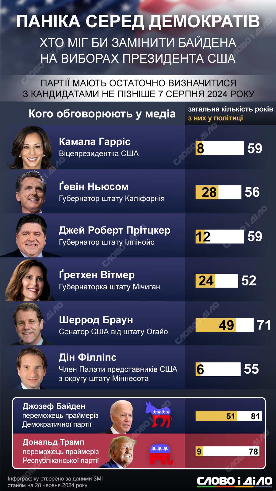 Publicația ucraineană „Slovo i dilo” (Cuvânt și faptă – n. t.) a întocmit și un clasament al potențialilor înlocuitori ai lui Biden la postul de președinte (infografic).