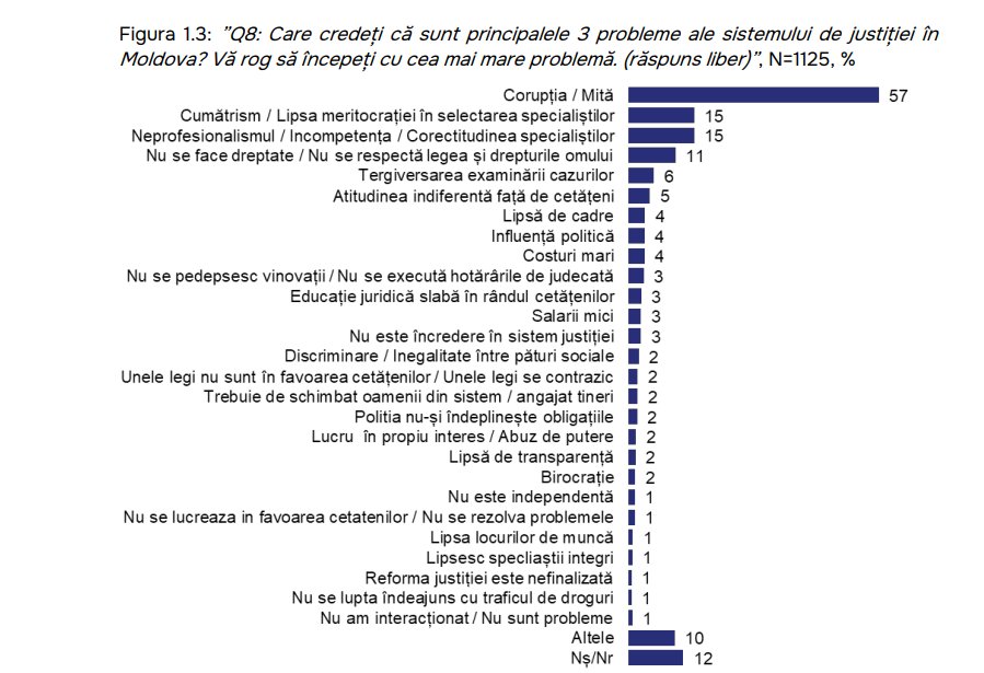 Întrebați care sunt principalele trei probleme ale sistemului de justiție, 57% dintre respondenți au spus că e corupția/mita, urmată de „cumătrism”/lipsa meritocrației și neprofesionalismul specialiștilor (câte 15%), transmite realitatea.md.