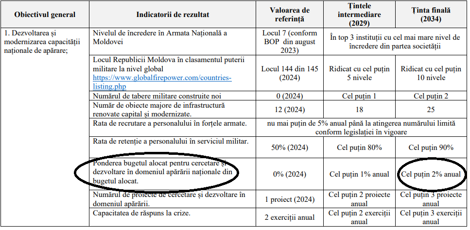 Potrivit proiectului, ca putere militară, țara noastră ocupă acum locul 144 din 145 la nivel mondial, însă parcurge un proces accelerat de dezvoltare și modernizare a capacităților naționale de apărare, pentru a asigura potențialul suficient de descurajare împotriva unei eventuale agresiuni. Până în 2029, Guvernul speră ca țara noastră să urce în acest clasament cu cel puțin cinci poziții, adică să ajungă pe locul 139.