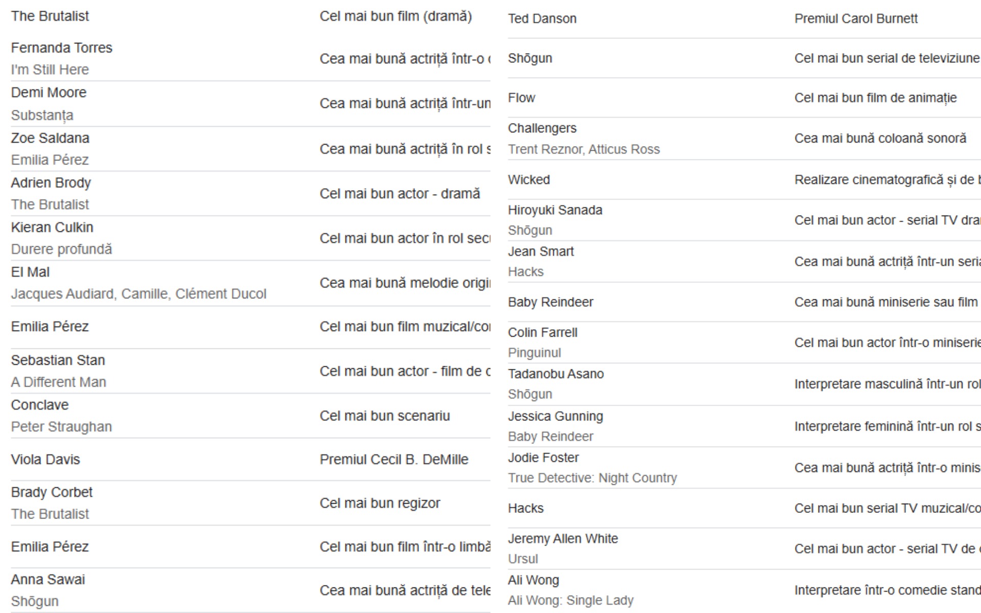 Cea mai bună actriță într-un film dramatic a fost desemnată Fernanda Torres, care s-a impus în fața unor celebrități precum Angelina Jolie, Kate Winslet, Nicole Kidman și Pamela Anderson. Demi Moore a devenit câștigătoarea trofeului la categoria cea mai bună actriță într-un film comedie sau dramă.