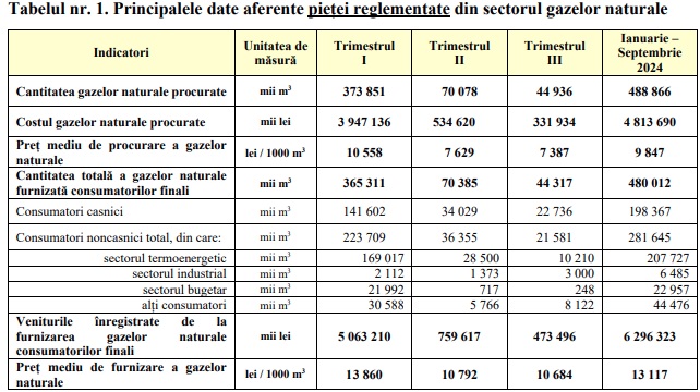 Datele ANRE mai arată că veniturile din furnizarea gazelor naturale se cifrează, pentru perioada ianuarie-septembrie, la șase miliarde 296 de milioane 323 de mii de lei. Cea mai mare parte, de 5 miliarde de lei, a fost obținută în primele trei luni ale anului.
